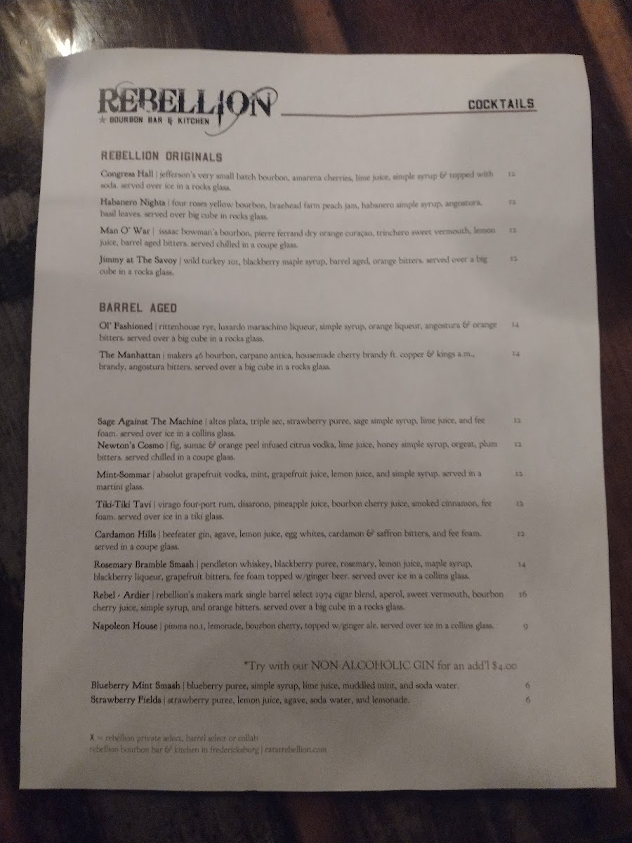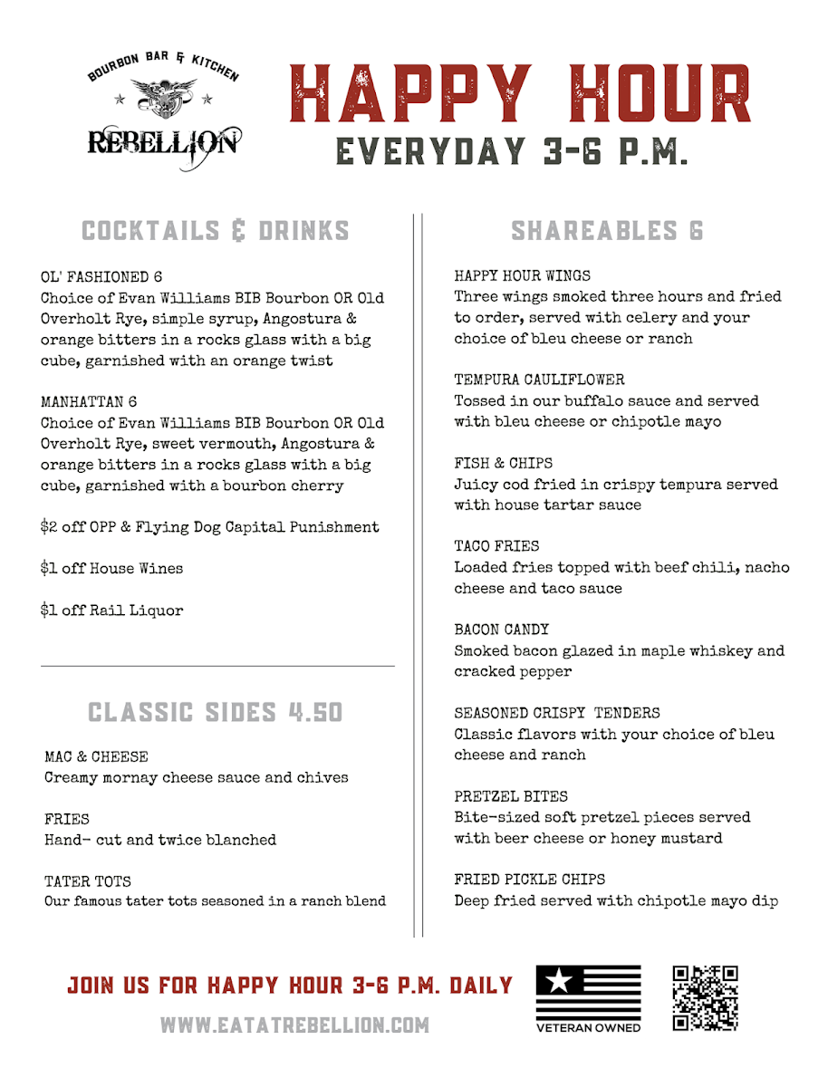 Welcome to Rebellion Bourbon Bar & Kitchen FXBG, where culinary creativity meets Southern charm in downtown Fredericksburg, Virginia. The menu is a delightful fusion of innovative handhelds, tantalizing starters, and comforting sides that cater to diverse palates.